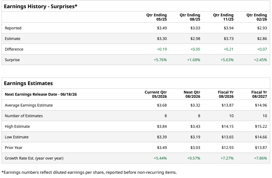 For fiscal 2026, analysts project the company’s EPS to be $13.87, up 7.3% from $12.93 in fiscal 2025. Moreover, its EPS is expected to rise by roughly 7.9% year over year (YoY) to $14.96 in fiscal 2027.