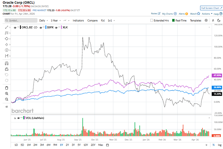 ORCL has surged 26% over the past 52 weeks, lagging behind both the S&P 500 Index's ($SPX) 30.6% return and the State Street Technology Select Sector SPDR ETF’s (XLK) 56% uptick over the same time period.