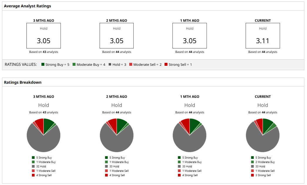 Based on 44 analysts with coverage, INTC stock has a consensus “Hold” rating. While five analysts have a “Strong Buy” rating for INTC stock, two analysts have a “Moderate Buy,” and a majority of 33 analysts have a “Hold” rating. Among the bears, one analyst has a “Moderate Sell” rating, with three analysts opining that INTC stock is a “Strong Sell.”