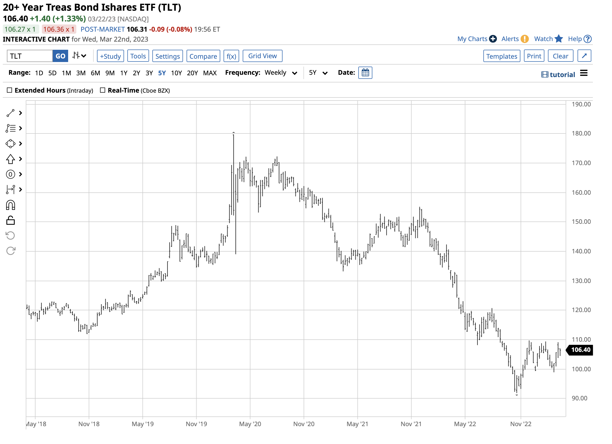The chart of the iShares 20+ Year Treasury Bond ETF (TLT) displays the same bearish pattern from March 2020 through late October 2022 that took TLT to a $91.85 low, the lowest level since April 2011. Since the late 2022 low, TLT has also stabilized, with the shares trading around the $106.40 level on March 22.
