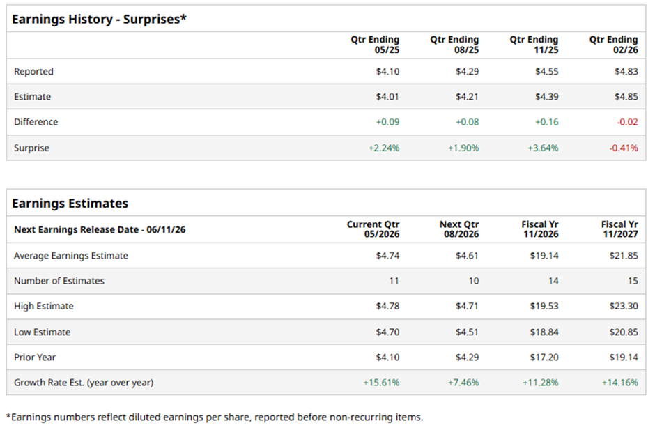 For fiscal 2026, analysts predict the creative software giant to report EPS of $19.14, a rise of 11.3% from $17.20 in fiscal 2025. Moreover, EPS is projected to increase 14.2% year-over-year to $21.85 in fiscal 2027.
