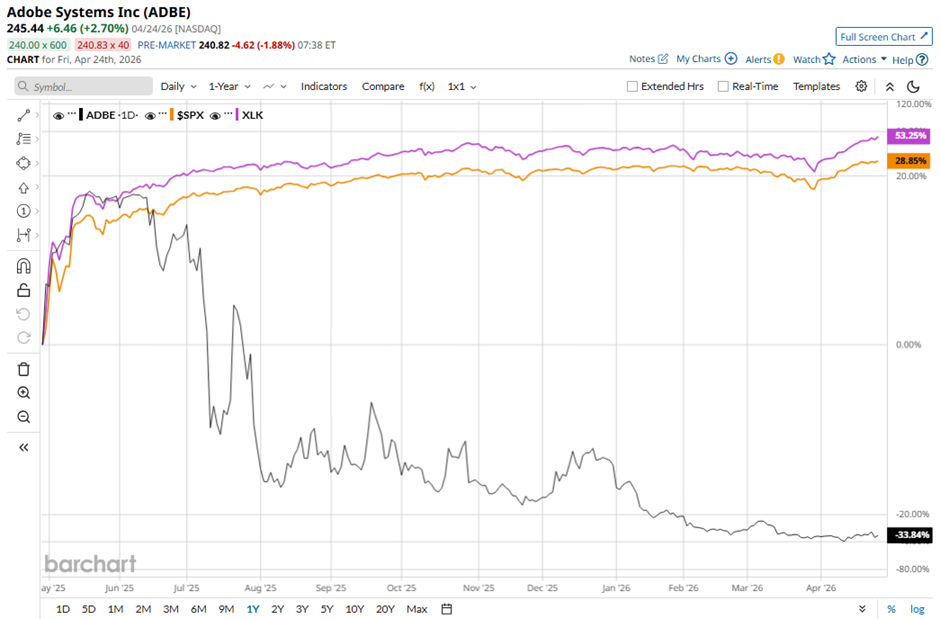 Shares of Adobe have decreased nearly 32% over the past 52 weeks, lagging behind the broader S&P 500 Index's ($SPX) 30.6% gain and the State Street Technology Select Sector SPDR ETF's (XLK) nearly 56% return over the same period.