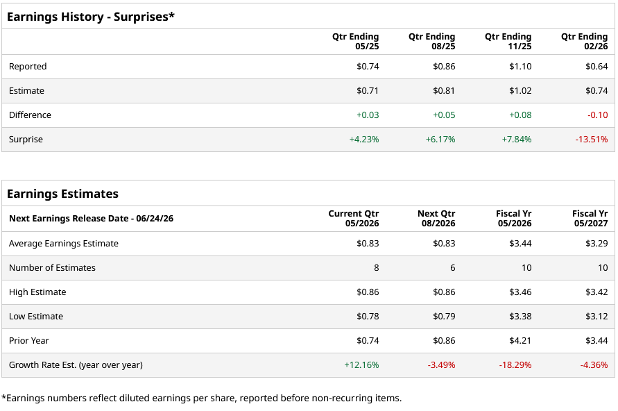 For fiscal 2026, analysts project the company’s EPS to be $3.44, down 18.3% from $4.21 in fiscal 2025. Moreover, its EPS is expected to decline by roughly 4.4% year over year (YoY) to $3.29 in fiscal 2027.