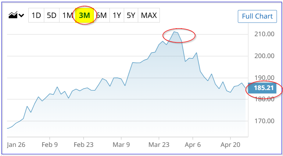 CVX closed at $185.21 on Friday, April 24, down 1.27%. It's now well off a peak price of $211.15 on March 27.