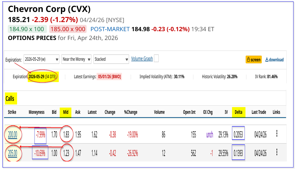 Note that the $200.00 call option has a very low delta ratio of just 0.2053. That implies there is less than a 21% chance that CVX will rise to $200 on or before May 29.
