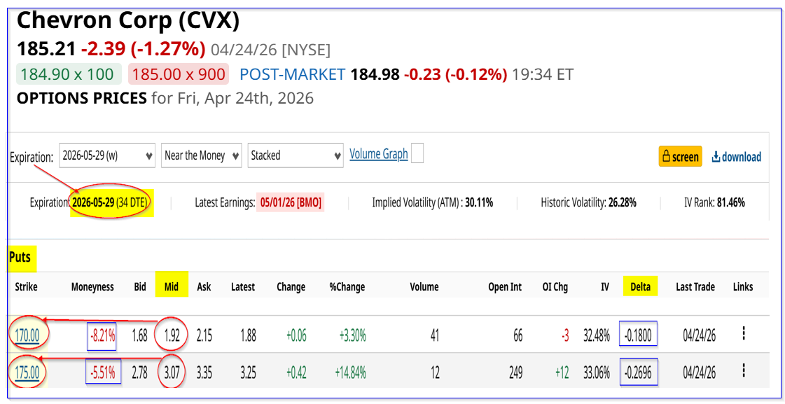 However, today, the put option is close to the money as CVX is at $185.21. An investor who shorted this put could wait for the account to be assigned to buy shares from the cash collateral. Then, owning 100 shares of CVX, the investor could sell short covered calls.