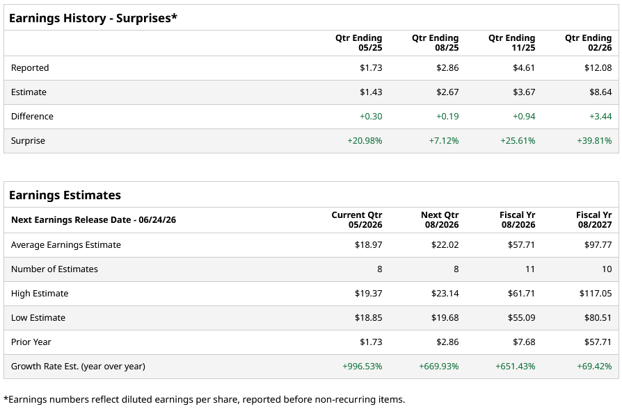 For fiscal 2026, analysts project the company’s EPS to be $57.71, up 651.4% from $7.68 in fiscal 2025. Moreover, its EPS is expected to rise by roughly 69.4% year over year (YoY) to $97.77 in fiscal 2027.