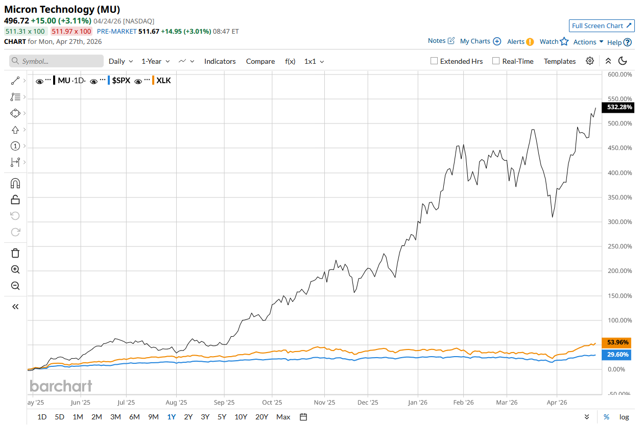 MU stock has declined 540.8% over the past 52 weeks, significantly outperforming the S&P 500 Index’s ($SPX) 30.6% rise and the State Street Technology Select Sector SPDR ETF’s (XLK) 56% rise during the same time frame.