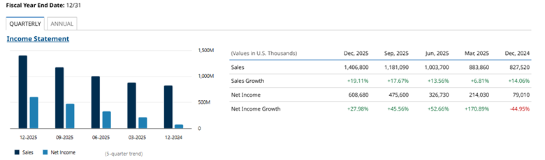 Pay attention to this spike. While in December 2024 quarterly net income was just $79 million on $827 million in revenue, the company made a huge leap in just one year. In the fourth quarter of 2025, revenue reached $1.41 billion — showing 19% sequential growth — while net income skyrocketed to $608.68 million. The margins boggle the mind.