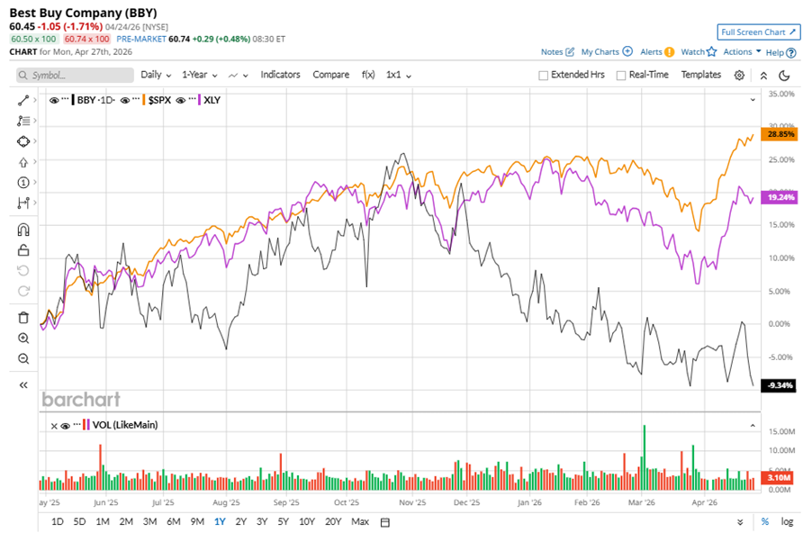 Best Buy’s underperformance stems from both macro and company-specific pressures. Persistent inflation and higher borrowing costs have curbed consumer appetite for big-ticket electronics, weighing on comparable sales. Structural headwinds including intensifying competition and supply constraints in key categories have further dampened investor sentiment. Ongoing tariff concerns have also raised costs and contributed to a muted outlook.