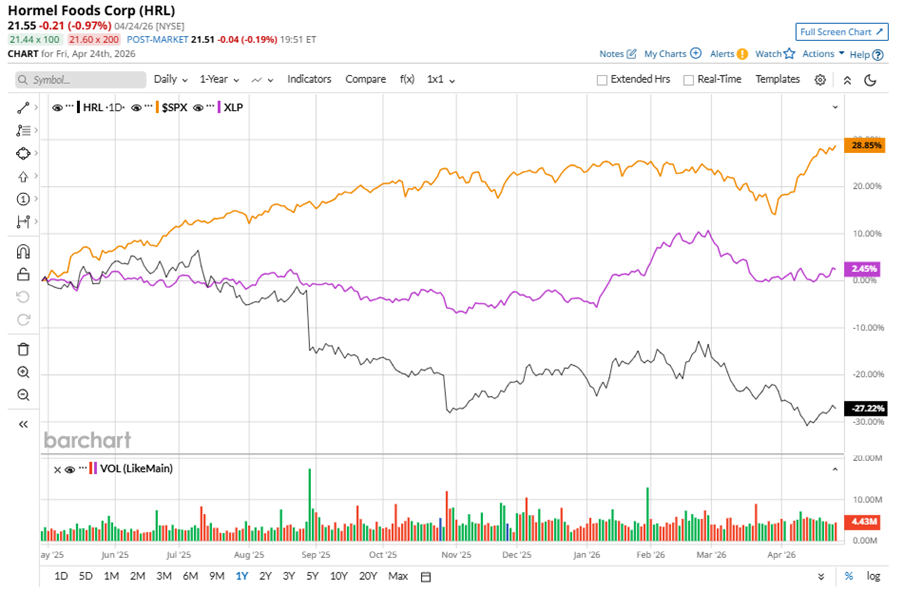 HRL stock has significantly underperformed the S&P 500 Index’s ($SPX) 30.6% gains over the past 52 weeks, with shares down 28.6% during this period. Similarly, it notably underperformed the State Street Consumer Staples Select Sector SPDR ETF’s (XLP) 2.7% gains over the same time frame.