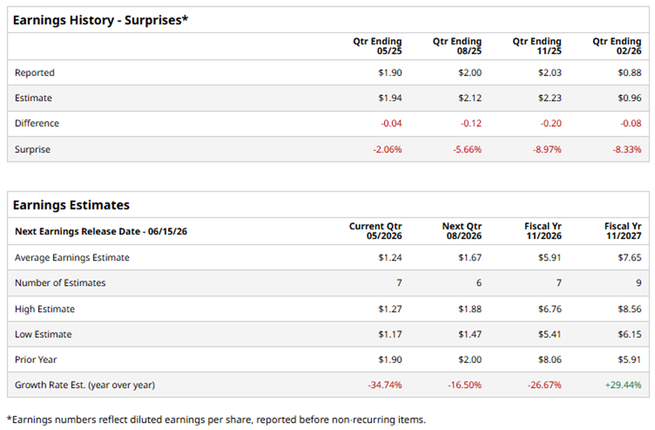 For fiscal 2026, analysts predict the homebuilder to report an adjusted EPS of $5.91, a decline of 26.7% from $8.06 in fiscal 2025. However, EPS is anticipated to grow 29.4% year-over-year to $7.65 in fiscal 2027.
