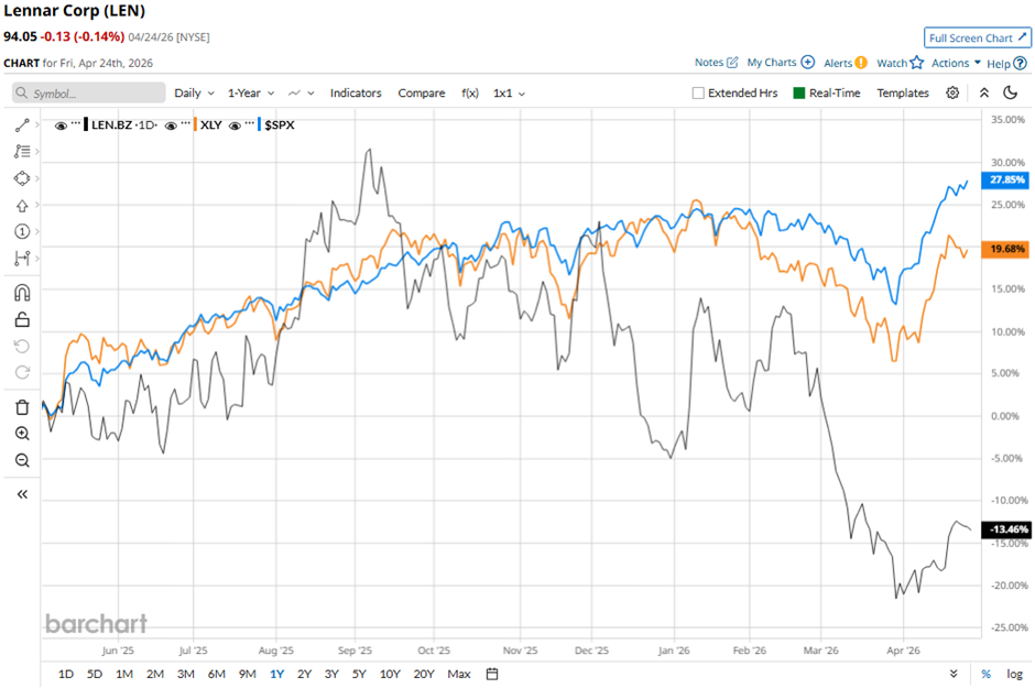 Shares of Lennar have dropped 13.9% over the past 52 weeks, lagging both the S&P 500 Index's ($SPX) 30.6% gain and the State Street Consumer Discretionary Select Sector SPDR ETF's (XLY) 19.6% increase over the period.