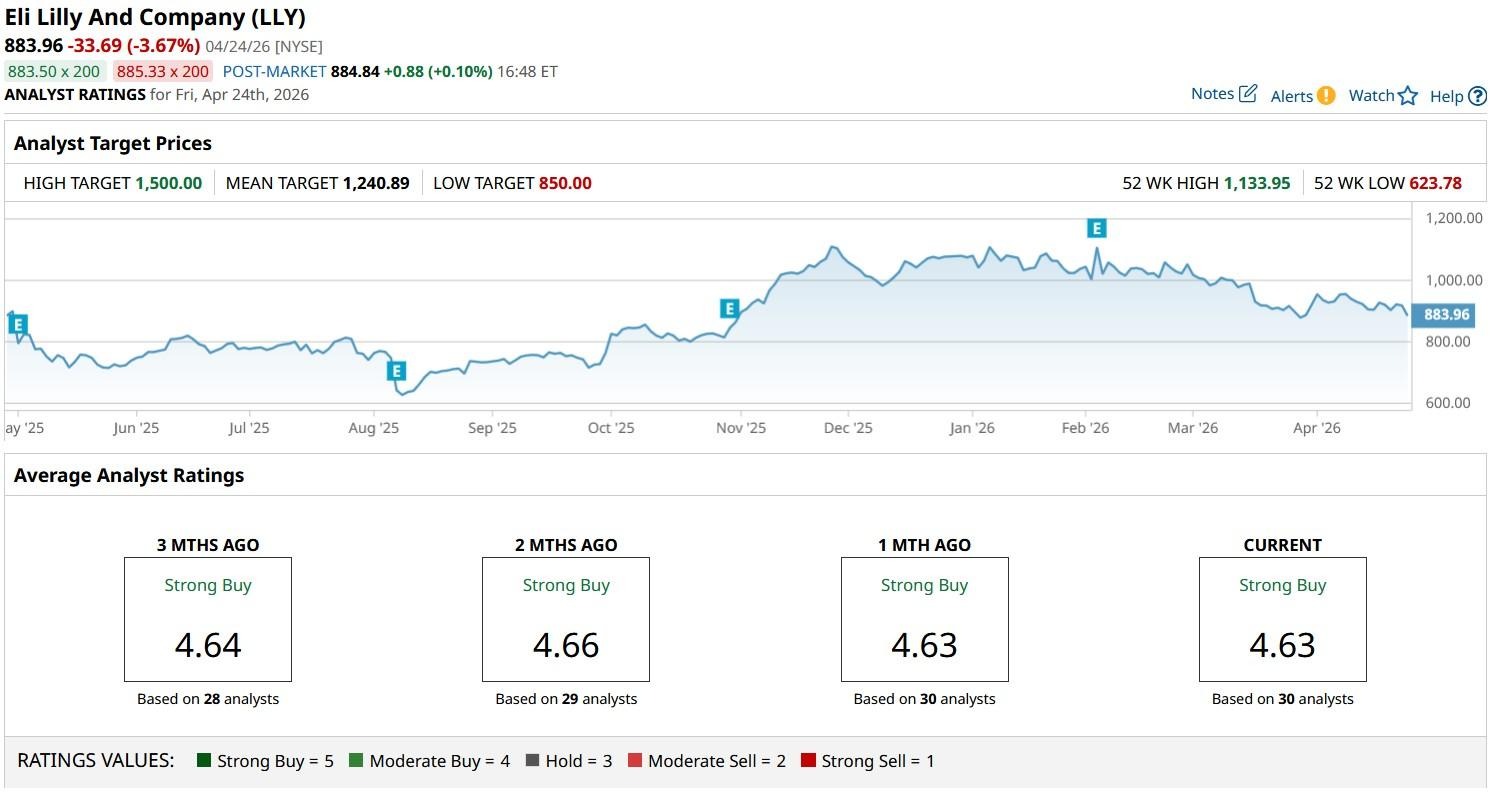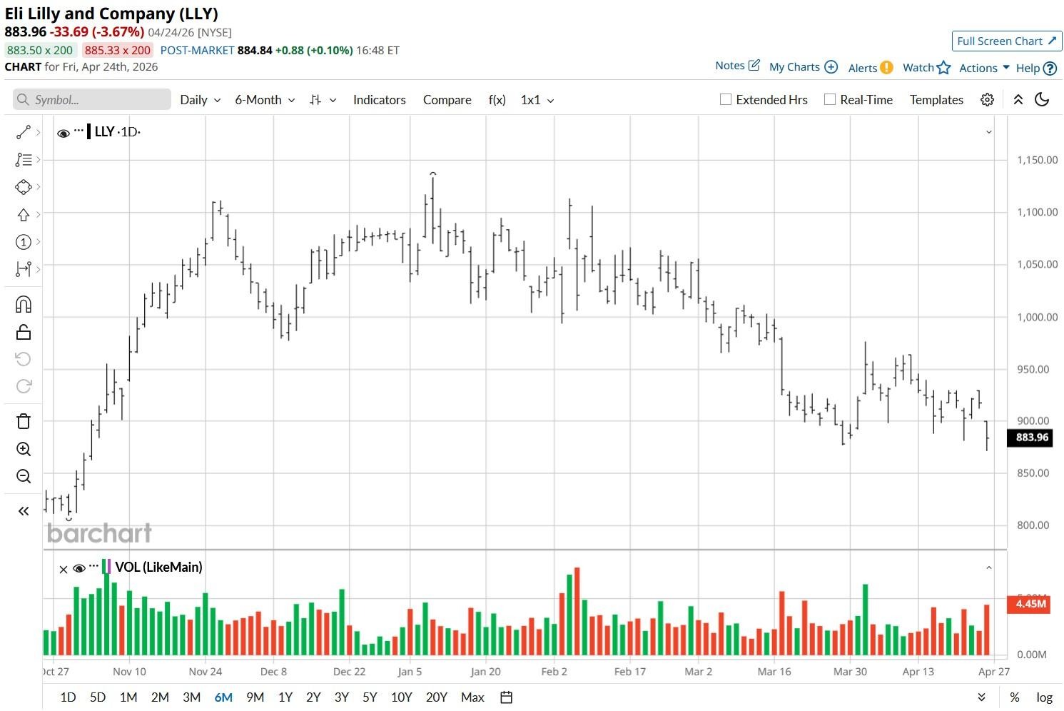 Eli Lilly (LLY) stock closed notably down on April 24 following reports that its newly launched oral obesity pill, Foundayo, is trailing Novo Nordisk’s (NVO) oral Wegovy in initial uptake.