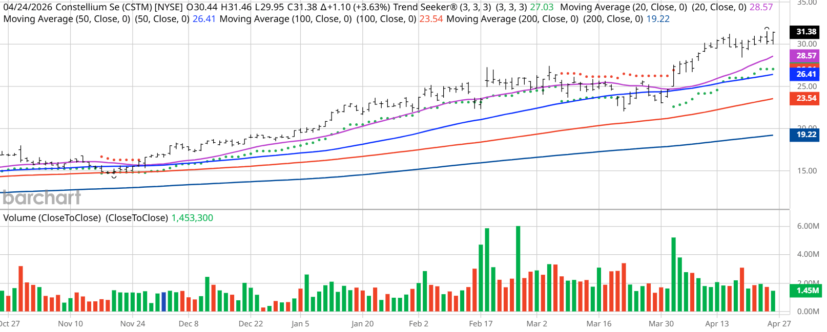 I found today’s Chart of the Day by using Barchart’s powerful screening functions to sort for stocks with the highest technical buy signals; superior current momentum in both strength and direction; and a Trend Seeker “buy” signal. I then used Barchart’s Flipcharts feature to review the charts for consistent price appreciation. CSTM checks those boxes. The Trend Seeker issued a new “Buy” signal on April 2. Since then, the stock has gained 13.61%.