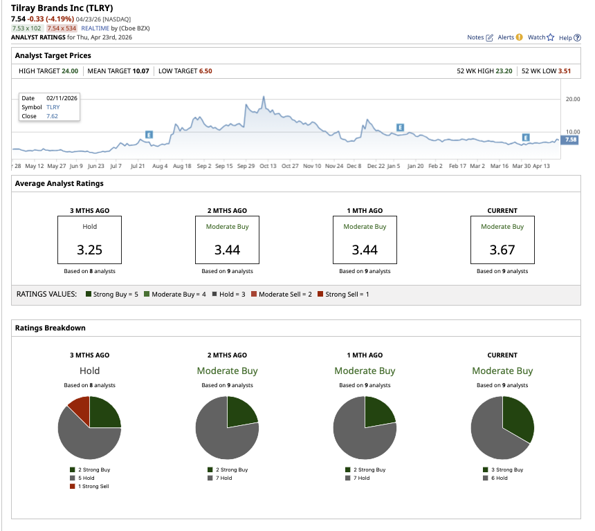 Overall, on Wall Street, TLRY stock is a consensus “Moderate Buy.” Out of the nine analysts covering the stock, three rate it as a “Strong Buy” while six have a “Hold" rating. While the stock is down 25% year-to-date (YTD), analysts expect shares to rally 51% from current levels based on the average target price of $10.07. Plus, the Street-high estimate of $24 indicates the stock could rise by as much as 260% in the next 12 months.