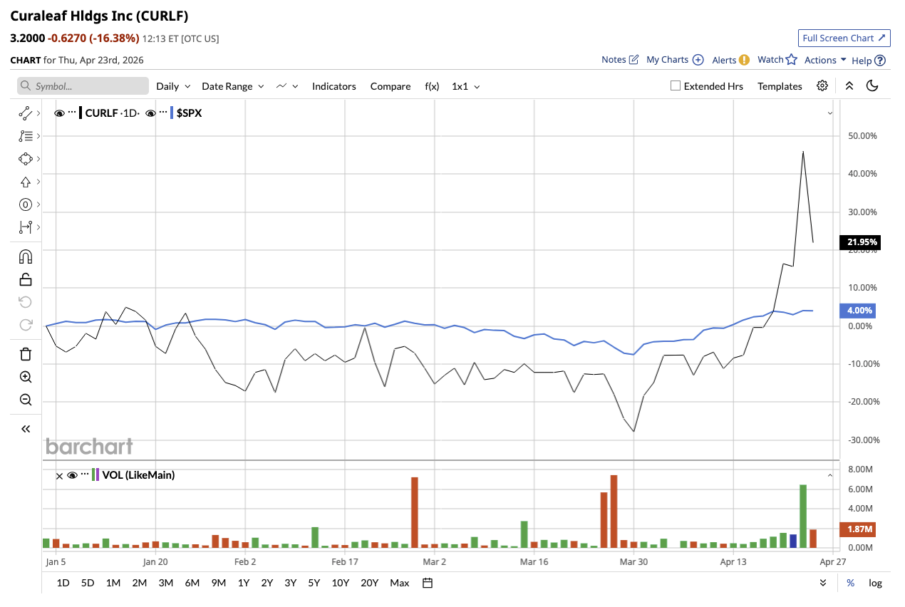 While Tilray offers international diversification, Curaleaf (CURLF) is a more direct bet on U.S. cannabis reform. The company is one of the largest multi-state operators in the United States, with more than 150 dispensaries across key markets. CURLF stock is up 29% YTD, outperforming the S&P 500 Index's ($SPX) gain of almost 5% YTD.