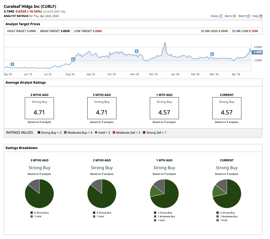 Overall, CURLF stock is a consensus “Strong Buy" on Wall Street. Out of the seven analysts covering the stock, five rate it as a “Strong Buy,” one analyst has a “Moderate Buy,” and one has a “Hold" rating.