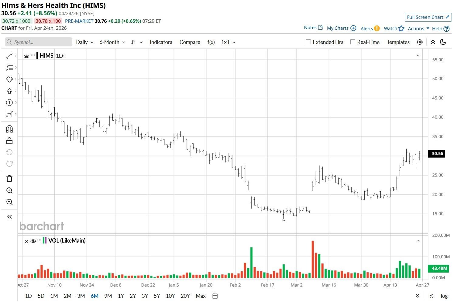 Hims & Hers stock has been in a sharp uptrend since late February, currently trading up more than 100% versus its year-to-date low.