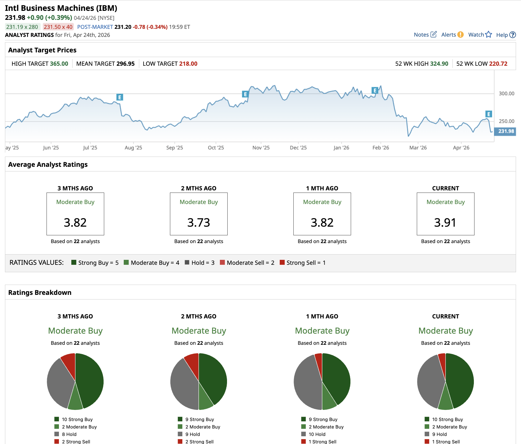 Out of the 22 analysts covering IBM stock, 10 recommend “Strong Buy,” two recommend “Moderate Buy,” nine recommend “Hold,” and one recommends “Strong Sell.” The average IBM stock price target is $296.95, above the current price of about $232.