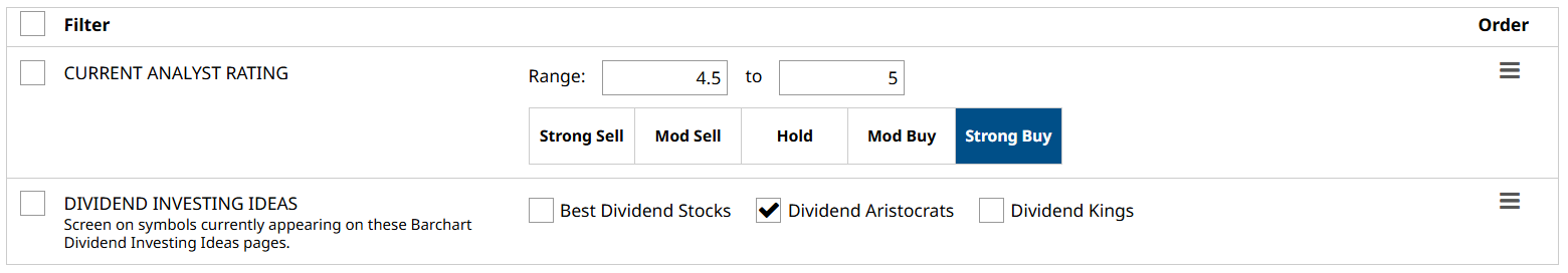 Using Barchart’s Stock Screener, I selected the following filters to get my list:
