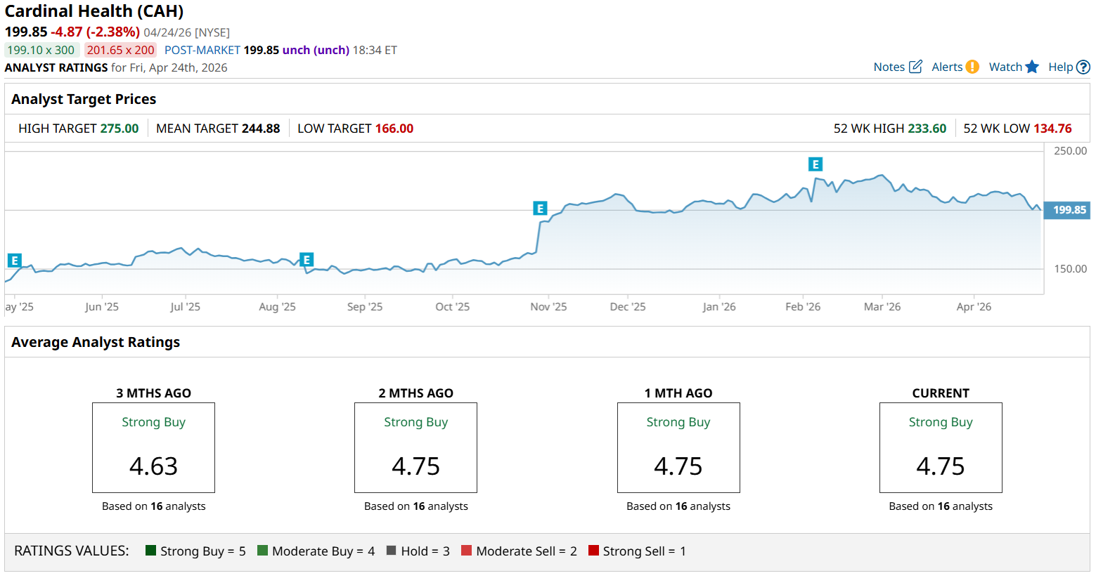 A consensus among 16 analysts rates it a “Strong Buy”, with a score of 4.75 out of 5, making it the highest-rated stock on this list. Also, the mean to high target prices suggest there's between 22% and 37% potential upside in CAH stock over the next year.