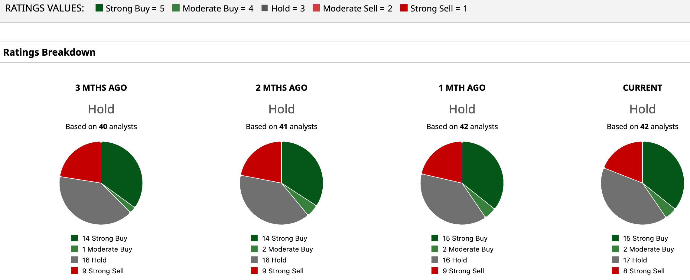Analysts remain sharply divided on Tesla. The stock has a “Hold” rating overall. Of the 42 analysts covering the stock, 15 recommend a “Strong Buy,” two have a “Moderate Buy,” 17 suggest a “Hold,” and the remaining eight have a “Strong Sell” rating.
