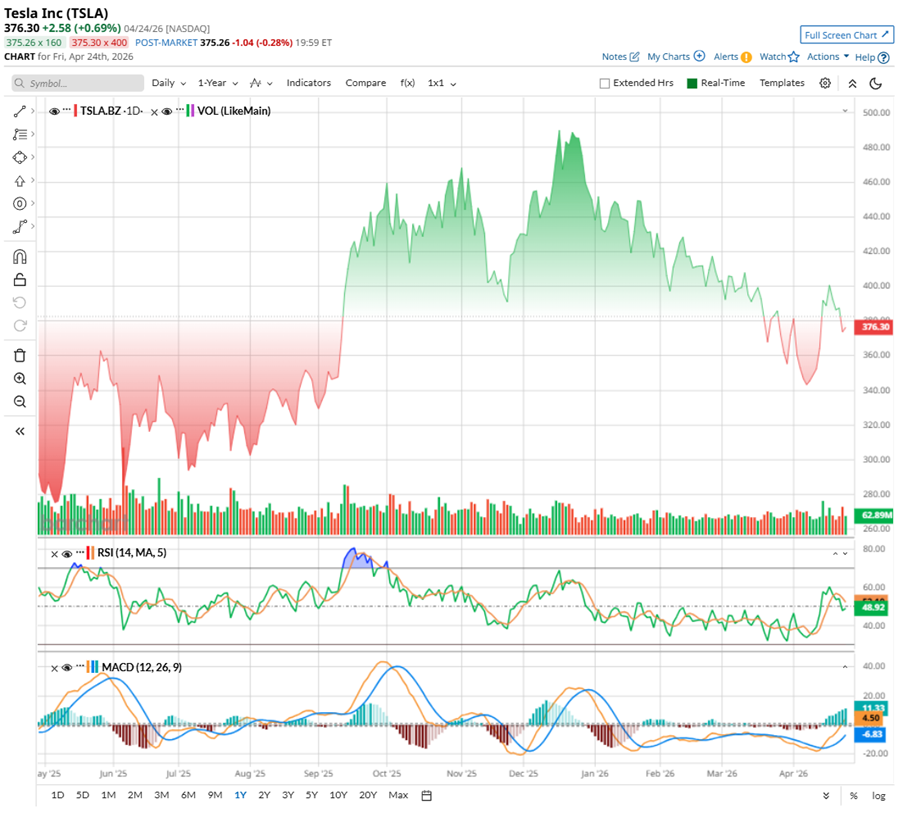 TSLA has not had an easy stretch from 2025 into 2026. It came into last year strong, even touching a high of $498.83 in December. But since then, the stock has cooled off, slipping to around $376 by late April, down 25.5% from the peak and 18.12% year-to-date (YTD).