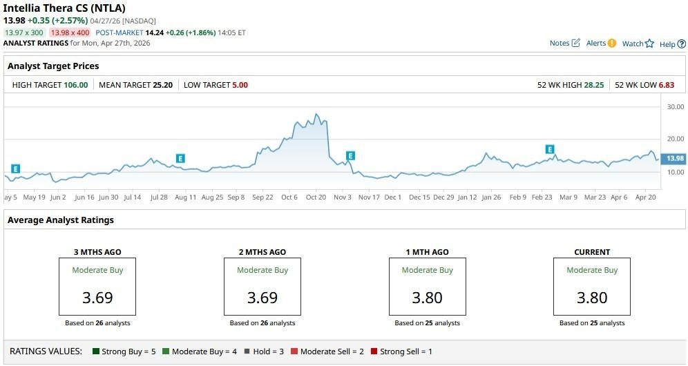 The consensus rating on NTLA shares sits at a “Moderate Buy” currently, with the mean price target of about $25 indicating potential for another 75% rally from here.