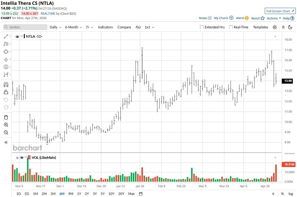Intellia Therapeutics stock has been a lucrative investment in 2026, currently up more than 50% versus the start of this year.