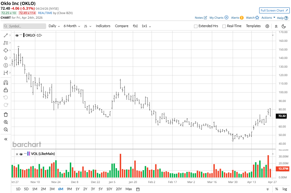 OKLO stock has experienced a meteoric rise of late, surging 214% over the past 12 months. This performance has been fueled in part by a significant April rally, including a nearly 6% rise on April 23 following news of the company's high-profile collaboration with Nvidia (NVDA) and Los Alamos National Laboratory.