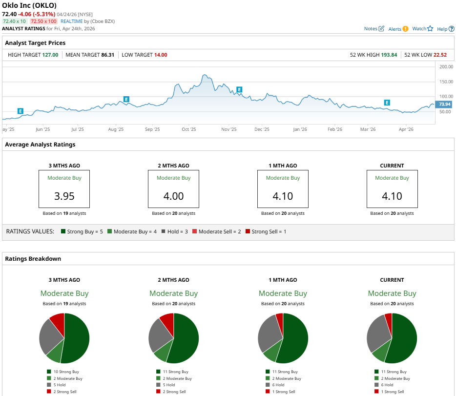 The Nvidia partnership has solidified Oklo’s position as a primary energy play for the AI sector. Currently, OKLO stock holds a consensus “Moderate Buy” rating with a mean price target of $86.31, representing potential upside of 15% from here. Analyst sentiment is also growing more favorable, considering the 20 analyst ratings on the stock. These opinions include 11 “Strong Buy” ratings, two "Moderate Buy" ratings, six "Hold" ratings, and one “Strong Sell.”