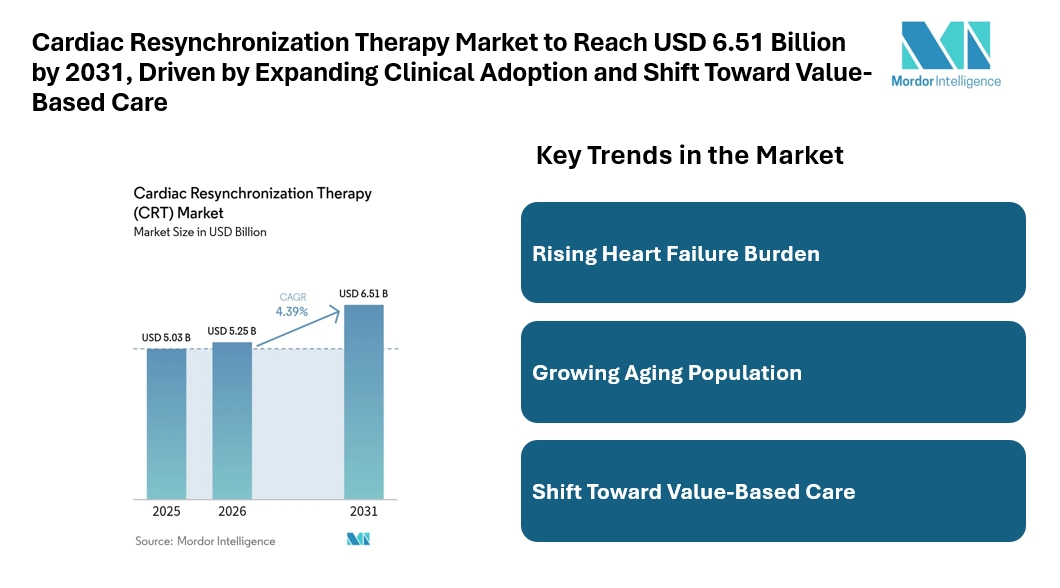 The Cardiac resynchronization therapy market continues to show steady progress as healthcare systems focus on improving outcomes for patients with heart failure. According to industry analysis, the Cardiac resynchronization therapy market size was valued at USD 5.03 billion in 2025 and is estimated to grow from USD 5.25 billion in 2026 to reach USD 6.51 billion by 2031, registering a CAGR of 4.39% during the forecast period. This growth reflects consistent demand for device-based cardiac care and the growing importance of long-term disease management.