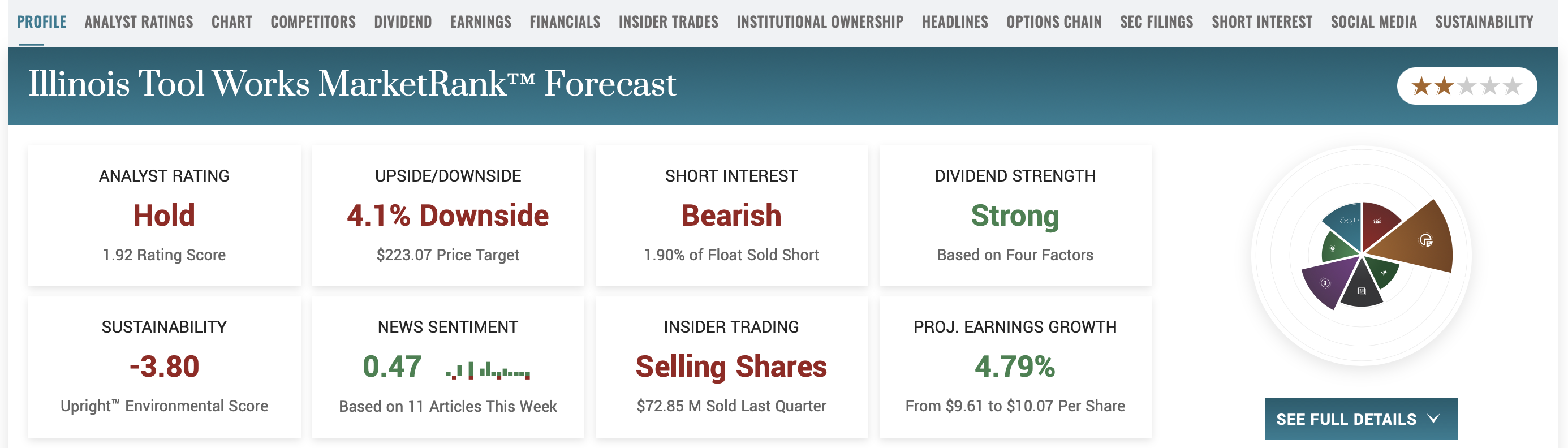 On Feb. 2, 2023, ITW released its fourth-quarter 2022 results for the quarter ending Dec. 2022. The company's GAAP earnings-per-share (EPS) profit of $2.95 includes the $0.61 of divestiture gains, which may not be comparable to the $2.53 consensus analyst estimates or missed by ($0.19) if backing out the divestiture gains. Revenues grew by 8% year-over-year (YOY) to $3.97 billion, beating analyst estimates of $3.90 billion. Foreign currency translations or the strong U.S. dollar headwind had a (5%) impact on revenues. The company declared a $1.31 dividend for shareholders of record March 31, 2023, with an ex-dividend on March 30, 2023. The dividend will be payable on April 13, 2023.