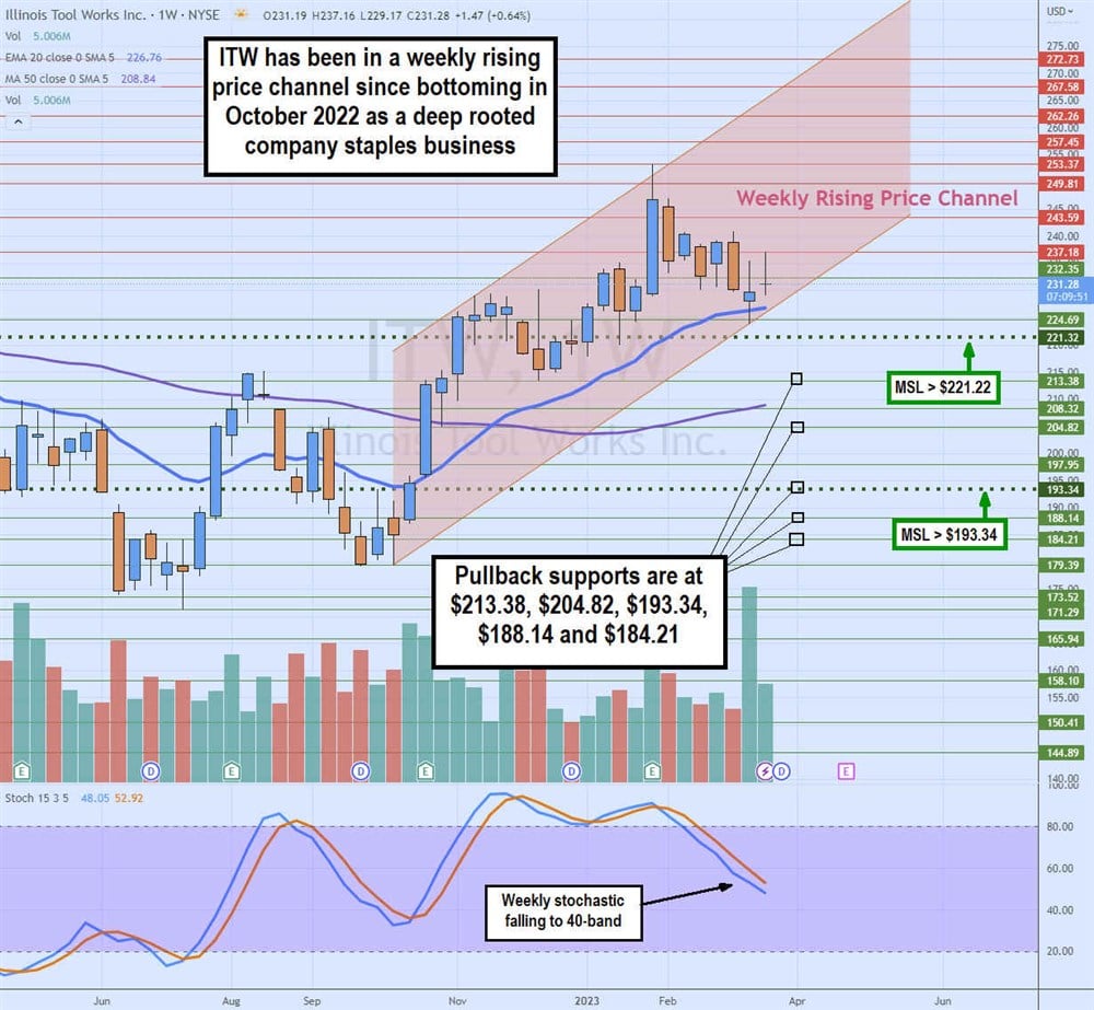 The weekly candlestick chart on ITW has been in a rising price channel since reaching a swing low of $179.39 in October 2023. Shares triggered their first weekly market structure low (MSL) on the $193.34 breakout powered by a rising stochastic. Shares triggered a second weekly MSL on the breakout through $221.32, driving the stock to a high of $253.37 at the end of January 2023.