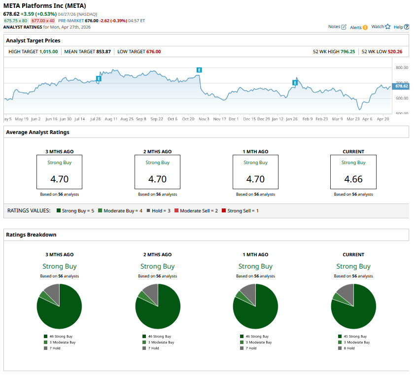 Among the 56 analysts covering META stock, the consensus is a “Strong Buy.” That’s based on 45 “Strong Buy” ratings, three “Moderate Buys,” and eight “Holds.”