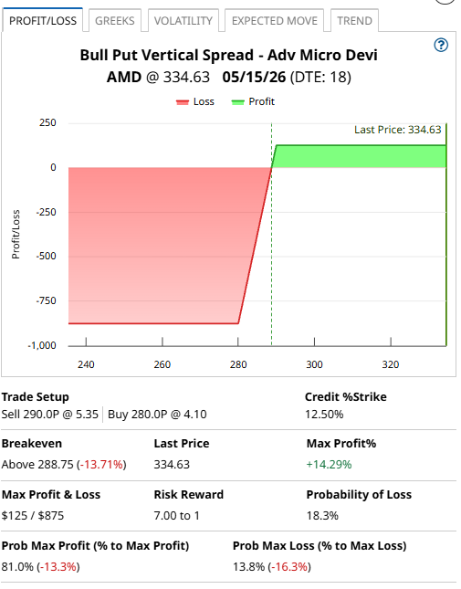 A trader selling the May 15th, $290-strike put and buying the $280-strike put on AMD would receive around $125 into their account, and would have a maximum risk of $875.