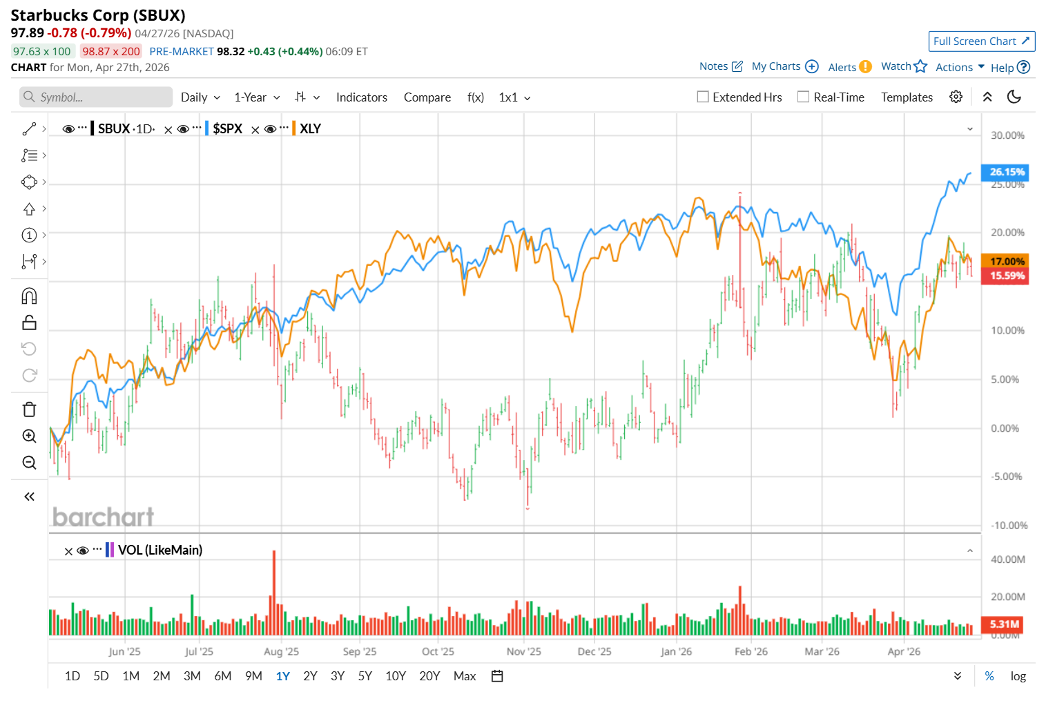 Narrowing the focus, SBUX has also lagged the State Street Consumer Discretionary Select Sector SPDR ETF’s (XLY) 19.3% uptick over the past 52 weeks. Nonetheless, it has notably outperformed XLY’s 1.3% YTD drop.