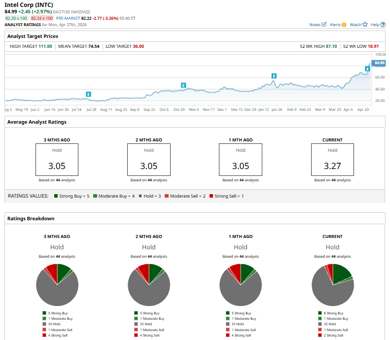 Among the 44 analysts covering INTC stock, the consensus is a “Hold.” That’s based on eight “Strong Buy” ratings, one “Moderate Buy,” 32 “Holds,” one “Moderate Sell,” and two “Strong Sells.”