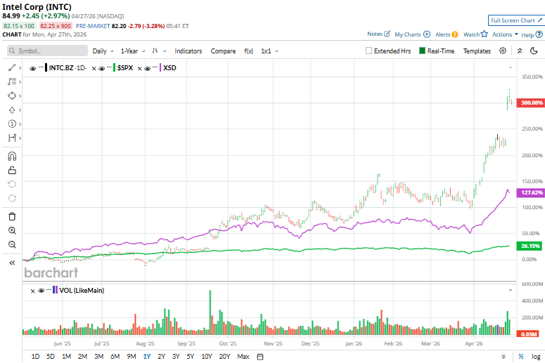 INTC has soared 323.9% over this time frame, well ahead of the broader S&P 500 Index ($SPX), which has rallied 29.8%. In 2026, INTC’s stock popped 130.3% compared to the SPX’s 4.8% rise on a YTD basis.