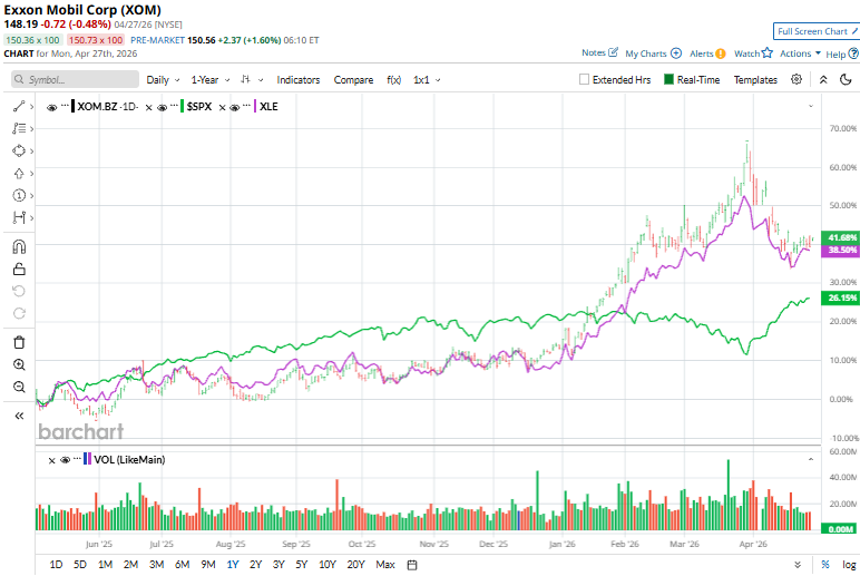However, compared to its own sector, Exxon’s gains have been slightly lower. The State Street Energy Select Sector SPDR ETF (XLE) has climbed 37.8% rise over the past 52 weeks and 27% in 2026, outperforming the stock.