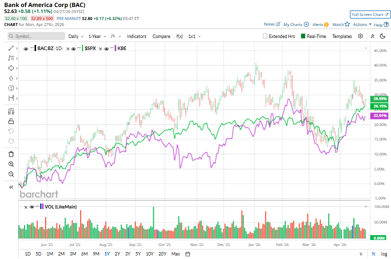 BAC stock has slightly outperformed the broader market over the past 52 weeks. BAC has gained 32.6% over this time frame, while the broader S&P 500 Index ($SPX) has rallied 29.8%. However, in 2026, shares of BAC are down 4.3%, compared to SPX's 4.8% gains.