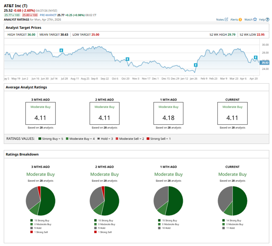 Shares of AT&T recovered marginally on Apr. 22 due to better-than-expected Q1 2026 adjusted EPS of $0.57 and revenue growth of 2.9% to $31.5 billion, driven by strong wireless and fiber performance. Subscriber growth also helped sentiment, with 294,000 postpaid phone net adds (above estimates), 158,000 retail wireless additions, and 584,000 new internet subscribers pushing total connections to 14.8M (up 30%). Additionally, increased bundling (45% of fiber customers also taking wireless) and momentum in advanced connectivity offset concerns about a 25.3% decline in legacy revenue and a 19% drop in free cash flow to $2.5 billion.