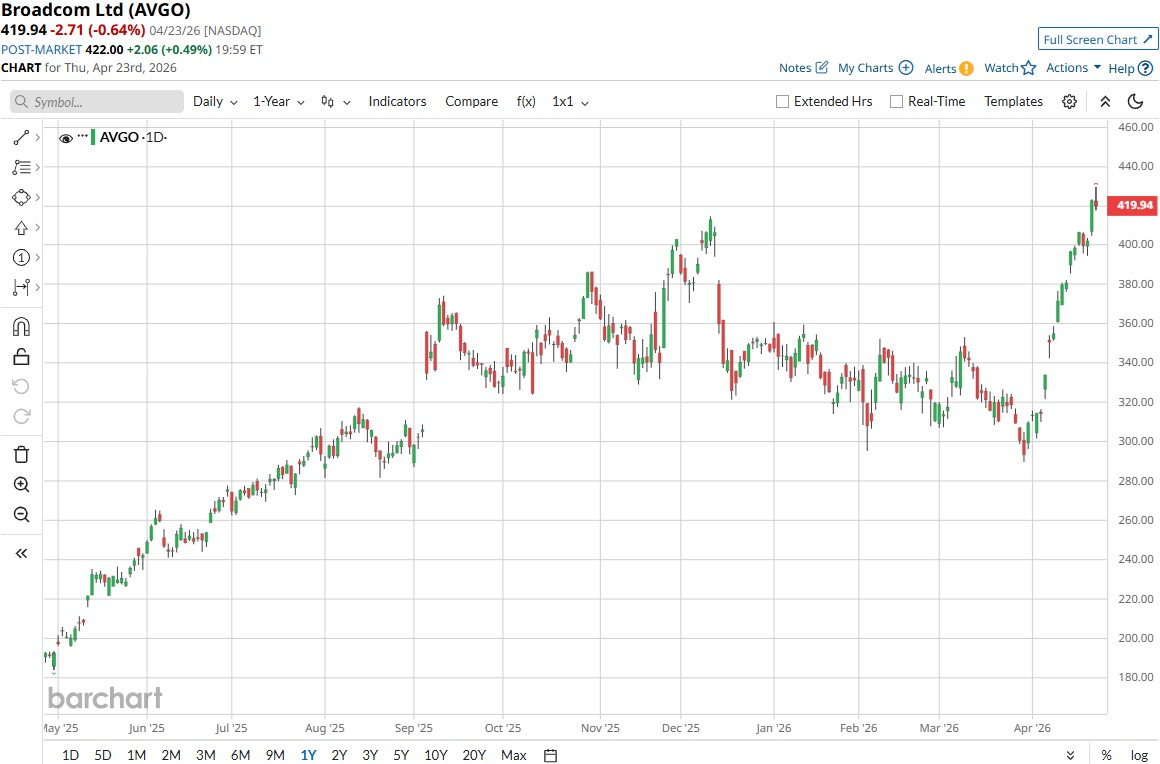 AVGO stock trades near $418 as of this writing, with shares up 21% year-to-date (YTD) and 117% over the past 52 weeks.