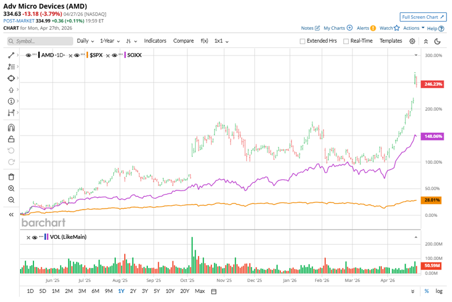 Shares of this semiconductor giant have significantly outperformed the broader market over the past year. AMD has gained 246.3% over this time frame, while the broader S&P 500 Index ($SPX) has rallied nearly 29.8%. In 2026, AMD stock is up 56.3%, surpassing the SPX’s 4.8% rise on a YTD basis.
