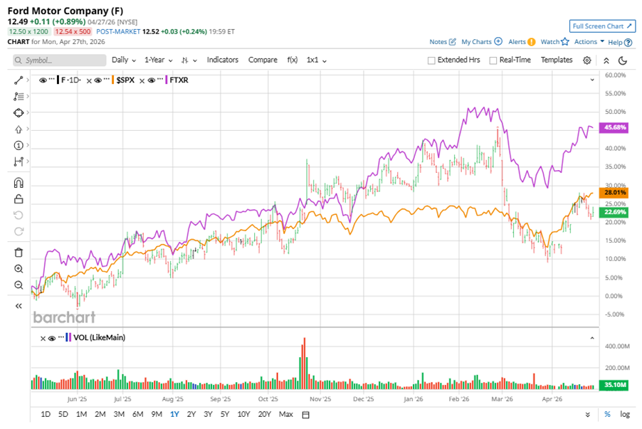 Shares of this auto giant have underperformed the broader market over the past year. F has gained 24.4% over this time frame, while the broader S&P 500 Index ($SPX) has rallied nearly 29.8%. In 2026, F stock is down 4.8%, compared to the SPX’s 4.8% rise on a YTD basis.
