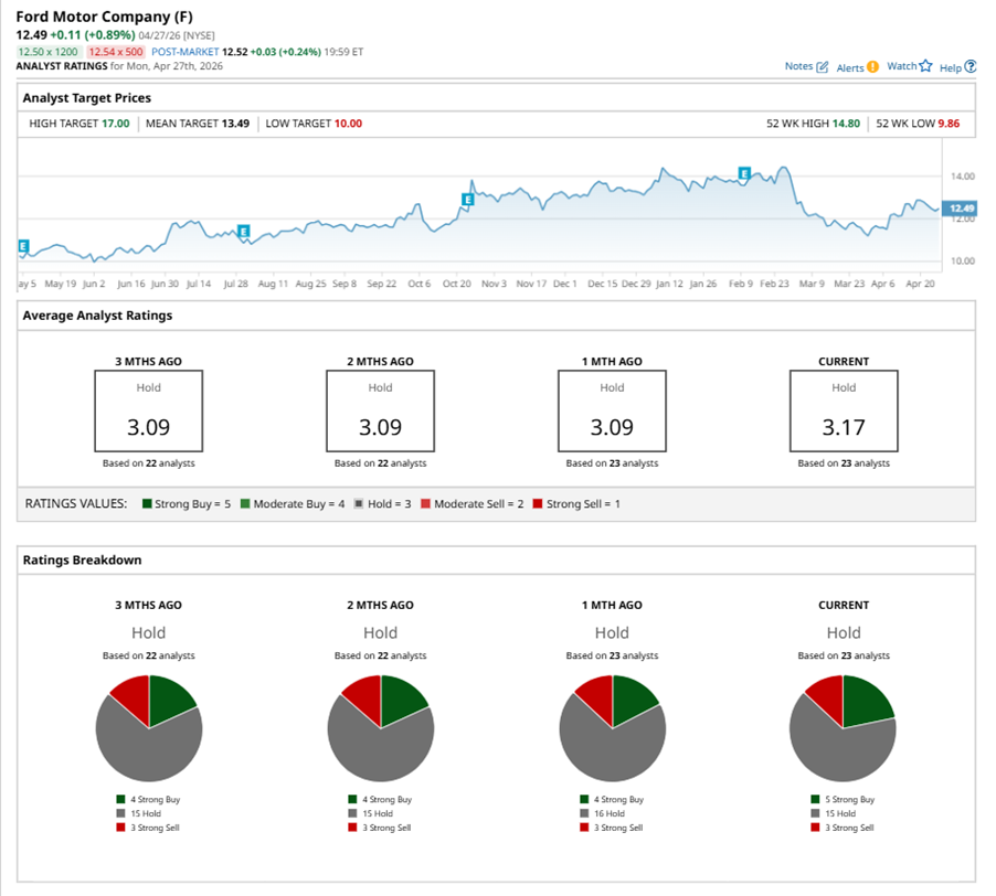 On Apr. 21, Barclays PLC (BCS) analyst Dan Levy maintained a “Hold” rating on F with a price target of $13, implying a potential upside of 4.1% from current levels.