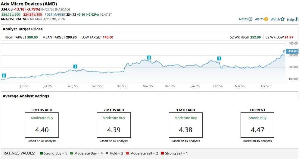While the consensus rating on AMD shares remains at a “Strong Buy”, the mean price target of about $291 signals potential for another 13% decline from here.
