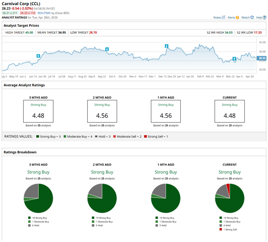 The mean price target of $34.95 represents a premium of 33.2% to CCL's current price. The Street-high price target of $45 suggests a 71.6% potential upside.