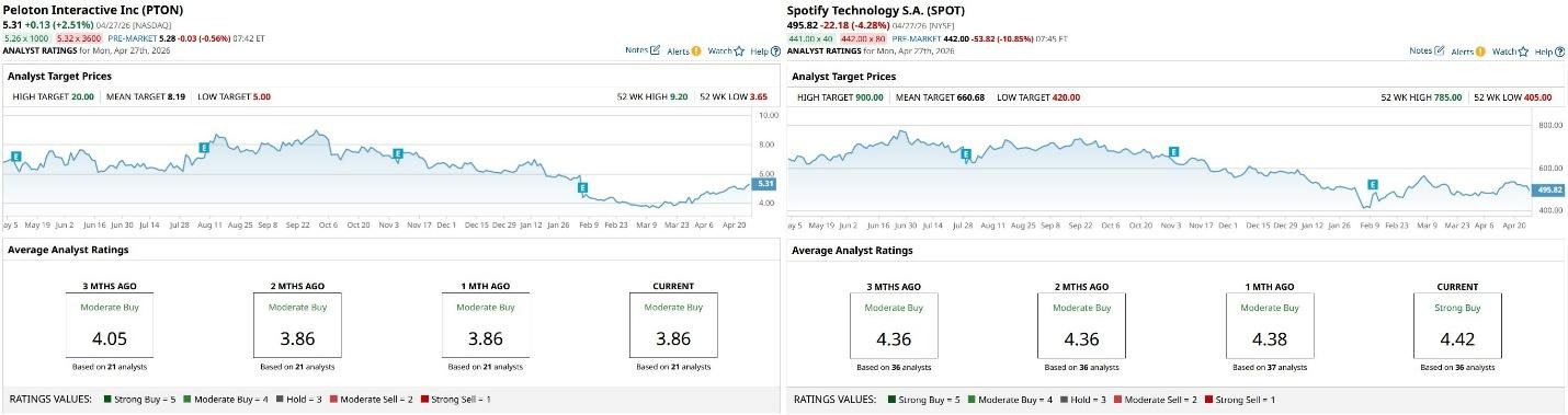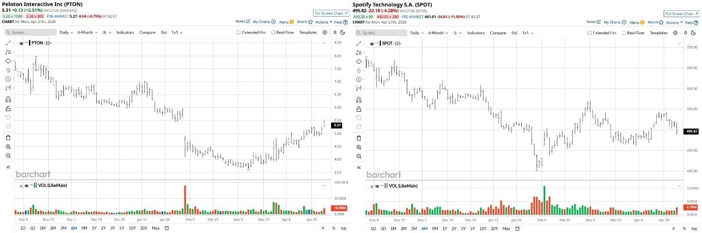 Peloton and Spotify have both been under pressure in 2026, with SPOT currently down about 17% versus its year-to-date high and PTON an even steeper 24%.
